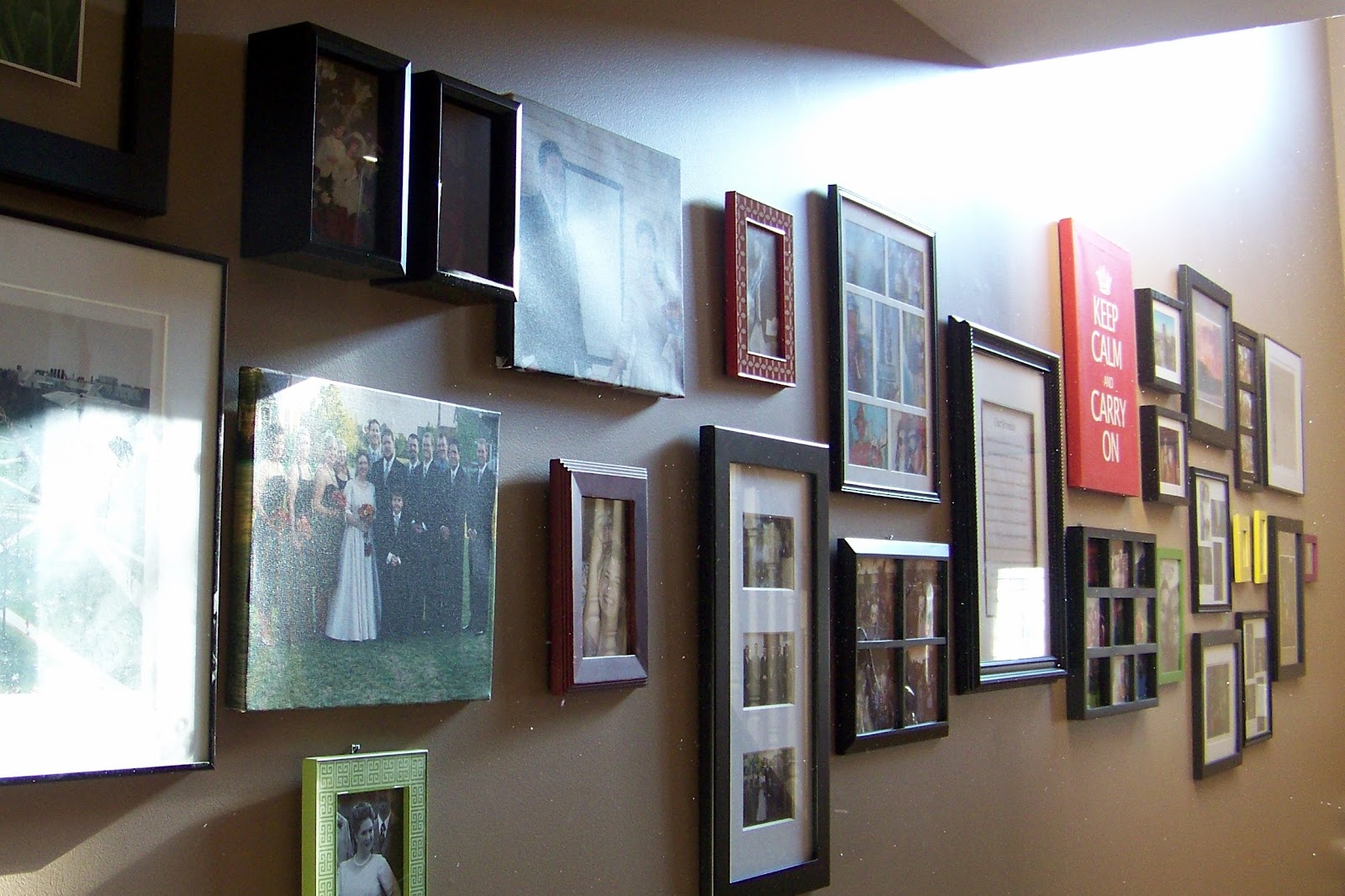 We didn't plan out our pictures first and just took a more creative approach, and started in the middle, and moved towards the ends of the hallway. The really nice thing about not buying additional things to decorate our new space is that all of our belongings are on remix! At our house the color frames were in one room, the black frames in the hallway, and the "Keep Calm and Carry On" canvas was in my office at work; now they all go together and I am really happy about the result. Many of the pictures are from our wedding, trips and travels, and good friends--it makes me really happy to see everything on a daily basis again.